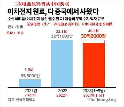 報告預測,這一趨勢未來或還會擴大。據(jù)韓聯(lián)社,以制備三元前驅體(鎳鈷錳氫氧化物,是生產鋰電池的重要材料)所需的氫氧化鋰為例,韓國對華逆差從2021年的5.5億美元驟增至2022年的32.1億美元。今年上半年的逆差更是已累計30.2億美元,照此趨勢,僅該單一品種的對華逆差就將達到60億美元