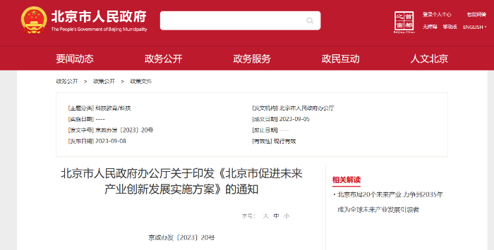北京市人民政府辦公廳關(guān)于印發(fā)《北京市促進未來產(chǎn)業(yè)創(chuàng)新發(fā)展實施方案》的通知