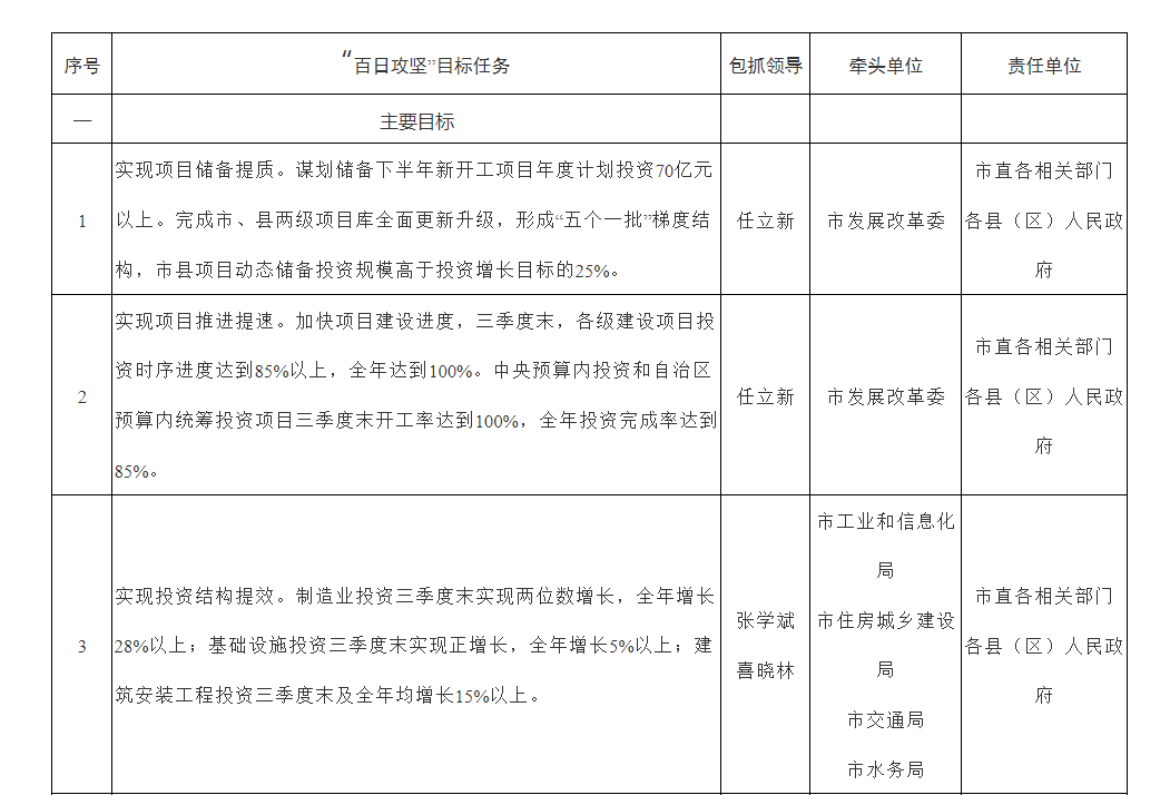 以下為《固原市貫徹落實(shí)自治區(qū)<擴(kuò)大有效投資百日攻堅(jiān)工作方案>目標(biāo)責(zé)任清單》原文。
