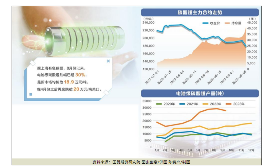 下游采購(gòu)動(dòng)力不足,原材料隨之走跌,電池級(jí)碳酸鋰再度跌破20萬元/噸,上海有色顯示的最新市場(chǎng)均價(jià)為18.9萬元/噸。
