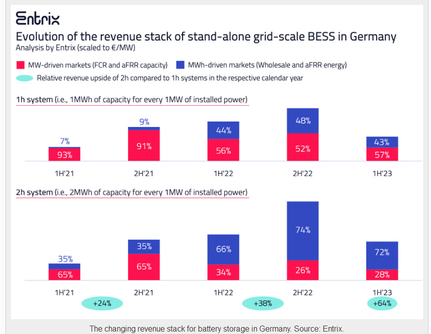 正如Entrix公司提供的圖表所示,德國(guó)運(yùn)營(yíng)的兩小時(shí)電池儲(chǔ)能系統(tǒng)的優(yōu)勢(shì)已經(jīng)從2021年的24%大幅增長(zhǎng)到2022年的38%。