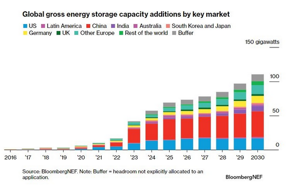 彭博新能源財經(jīng)公司對到2030年底全球主要市場部署儲能系統(tǒng)裝機容量的預(yù)測