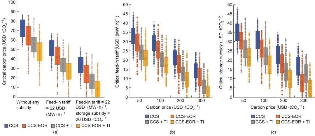 圖3. 不同情景下煤電開展CCUS技術(shù)所需激勵政策的臨界值。