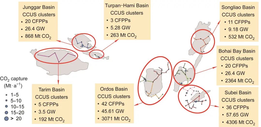 在華東地區(qū),總裝機容量為57.65 GW的36個煤電廠(75臺機組)被劃分為三個CCUS項目集群,運輸?shù)教K北盆地進行利用與埋存,平均管道長度為60 km。