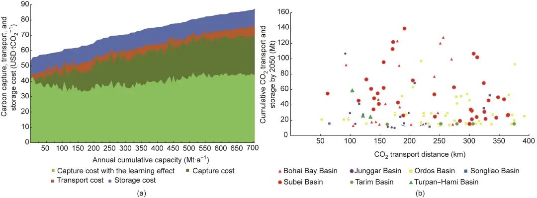 圖1. 成本效益結(jié)果、電廠匹配的埋存盆地運輸距離和2050年CO2累計埋存量。