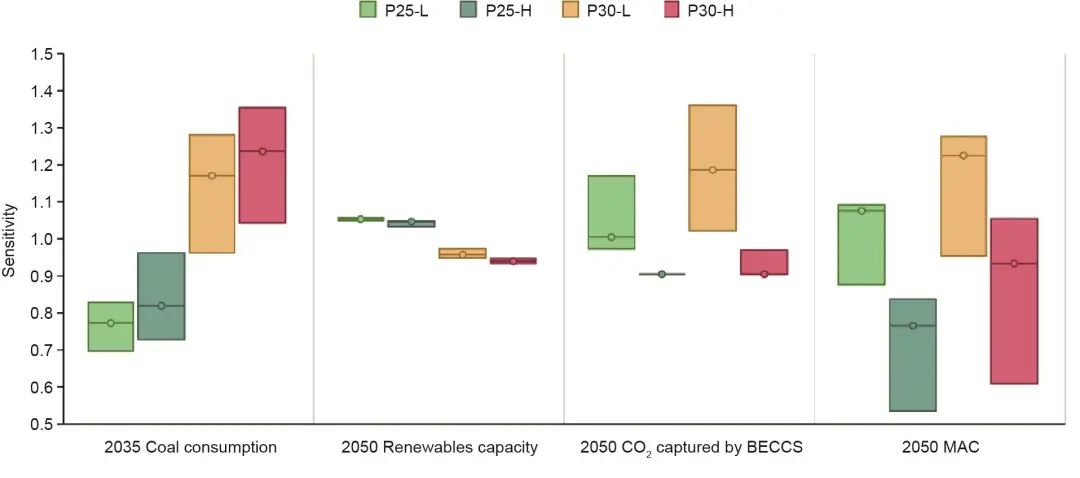 圖11. 2035年煤炭消費、2050年可再生能源裝機容量、2050年BECCS產(chǎn)生的負排放和2050年邊際減排成本的靈敏性分析。在固定峰值水平、達峰時間和2050年排放水平的情況下,2011—2050年每個靈敏性情景下累計排放增加或減少5%。根據(jù)基礎(chǔ)情景的平均值對結(jié)果進行歸一化處理。箱型圖中的空心點代表了基礎(chǔ)情景下的數(shù)值。