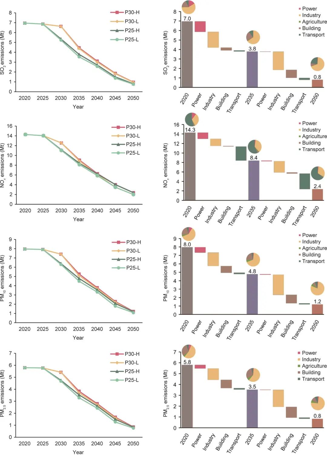 圖10. CO2減排對局地空氣污染物治理的協(xié)同效應(yīng)(左)和P25-H情景下,2020—2035年和2035—2050年兩段時期,各部門對于局地空氣污染物減排的貢獻分解(右)。