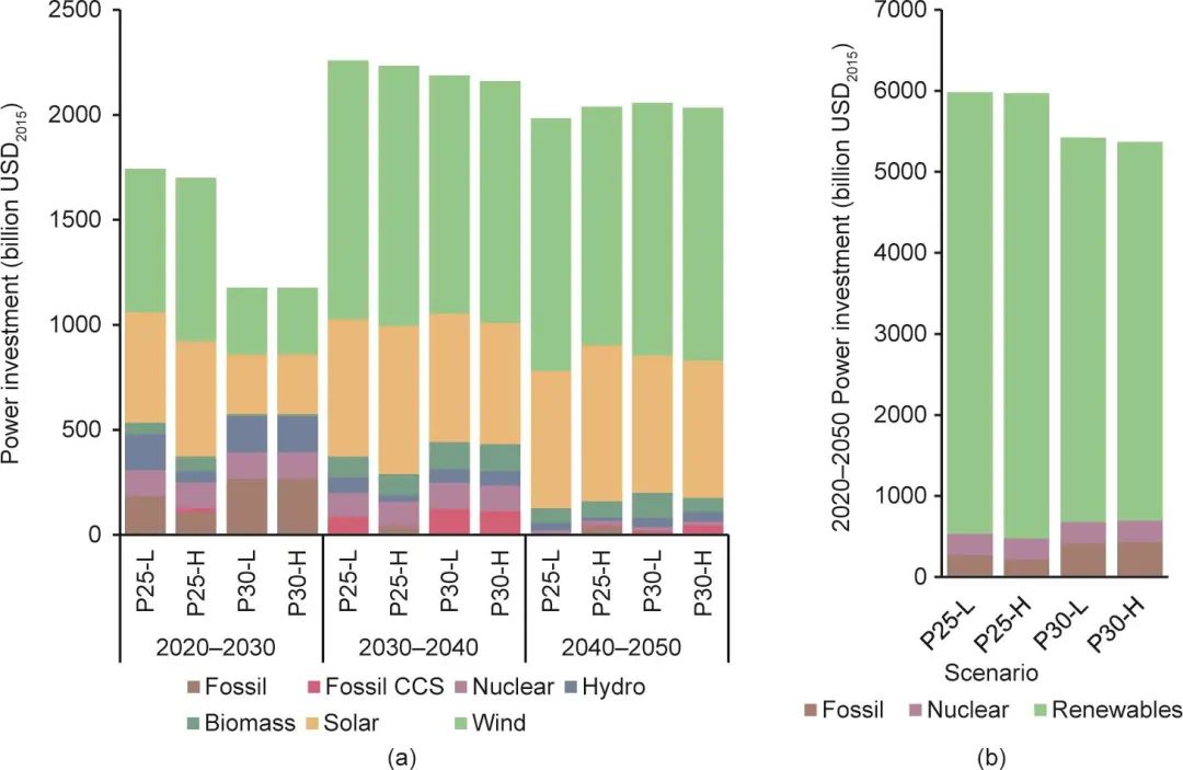 圖9. 電力部門不同技術(shù)投資(a)和2020—2050年電力部門總投資(b)。USD2015表示采用2015年美元不變價,并且按照2015年官方公布的匯率將人民幣轉(zhuǎn)換為美元進行統(tǒng)計。