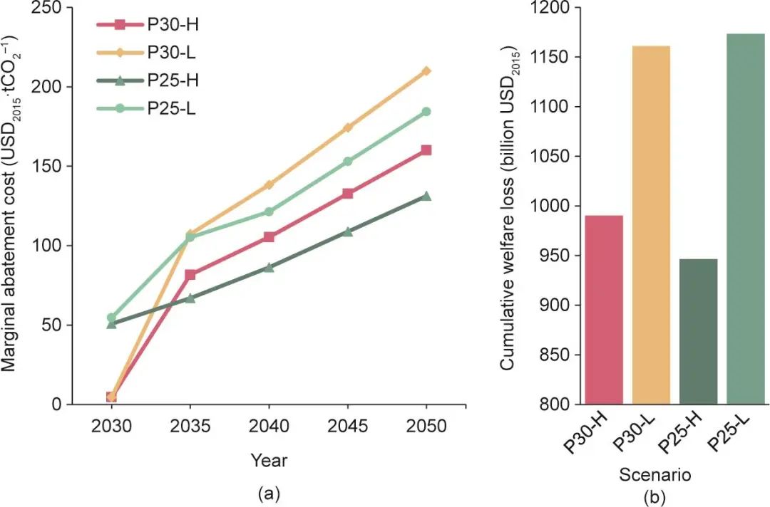 圖8. 邊際減排成本(a)和累計福利損失(b)。