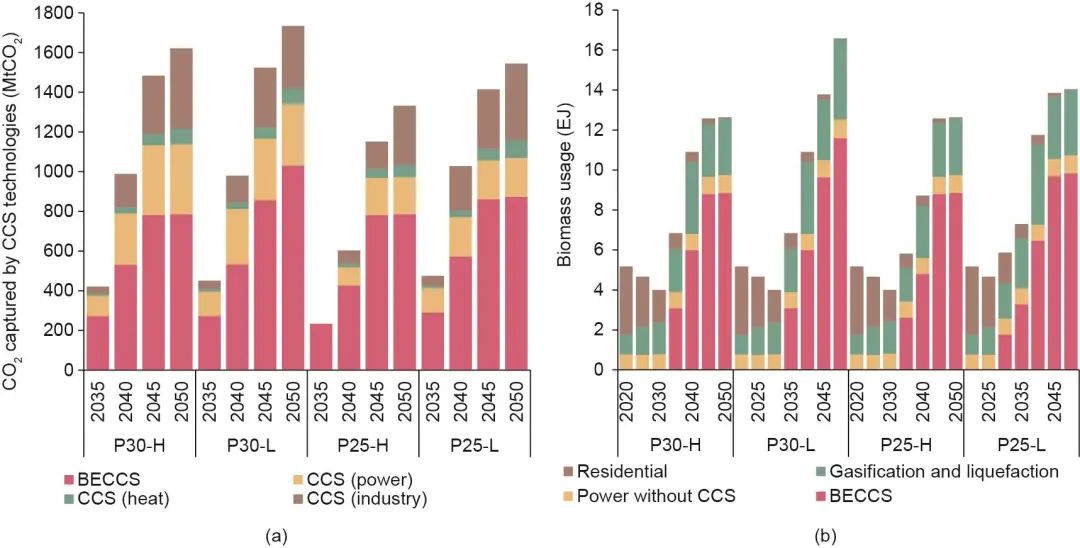 圖7. 不同CCS技術(shù)的二氧化碳捕集量(a)和生物質(zhì)使用量(b)。