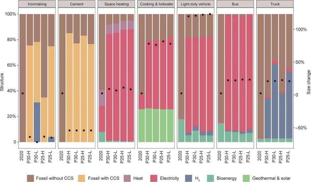 圖6. 2020—2050年能源服務(wù)需求的規(guī)模和技術(shù)占比變化。黑點表示了與2020年相比,能源服務(wù)需求增加(減少)的百分比。