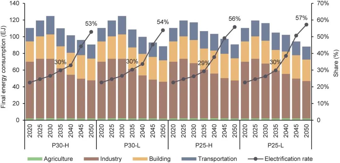 中國交通部門目前仍在快速擴張,2019年中國私人汽車千人保有量為174輛,預(yù)計到2050年千人汽車保有量將上升至400輛。此外,到2050年,卡車數(shù)量也會較當前增長超過20%,航空需求將增加150%,這將給交通部門的減排帶來更嚴峻的挑戰(zhàn)。在周轉(zhuǎn)量大幅增長的情況下,能源消費的最終下降主要源于電動汽車和氫燃料電池汽車效率遠高于當前的內(nèi)燃機汽車。到2050年,超過70%的輕型車輛和90%的大型客車將采用電力驅(qū)動,在達到碳中和時,剩余的大部分內(nèi)燃機汽車也將被逐漸淘汰。電力在重型卡車領(lǐng)域的普及存在現(xiàn)實障礙,因而貨運交通的脫碳將寄希望于氫能。然而由于氫能生產(chǎn)的成本過高,只有在強大的脫碳壓力下,氫能才會迅速取代化石燃料。例如,在P30-L和P25-L情景下,氫能在卡車中的消費占比將達到50%以上,而在其他兩個情景下,則僅有約33%。