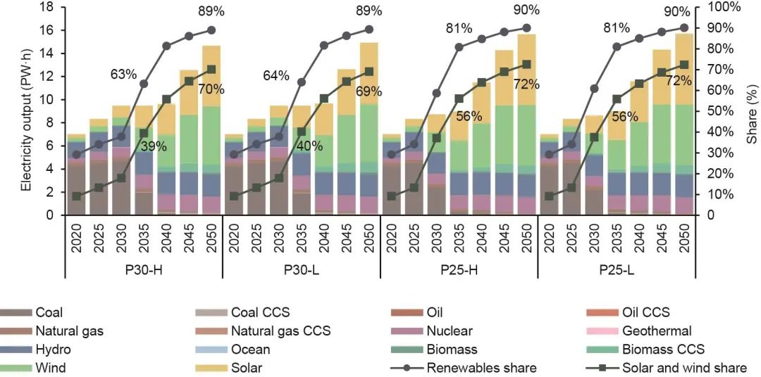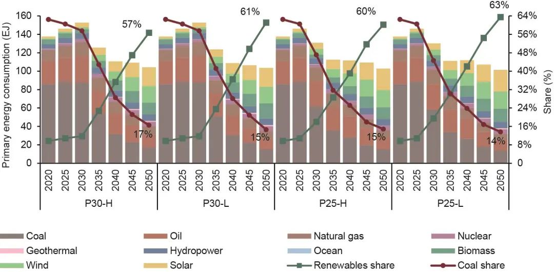 相比之下,可再生能源目前占一次能源消費的10%,同時增長緩慢,主要是為了滿足增量能源需求。未來,可再生能源將最有希望填補由煤炭消費下降造成的缺口,從而逐步取代化石燃料。據(jù)測算,在2035—2040年,可再生能源將超越化石燃料,成為中國最主要的能源。到2050年,中國一次能源消費中可再生能源比重將達到約60%。同樣,對于2050年碳預(yù)算較低或者開始減排較早的情景(P25-L、P25-H和P30-L),可再生能源的占比將更高。