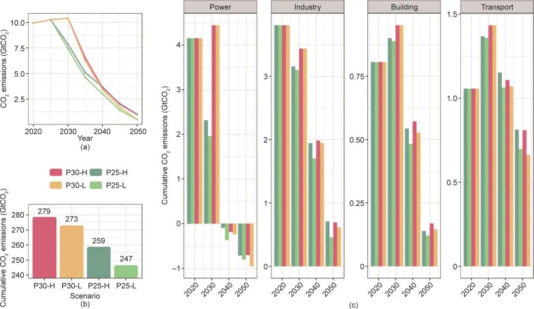 圖2. (a)能源系統(tǒng)減排路徑;(b)2011—2050年累計碳排放;(c)分部門碳排放情況。