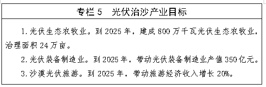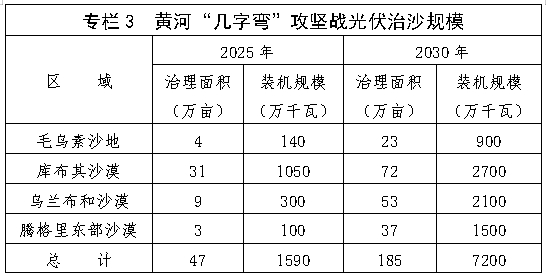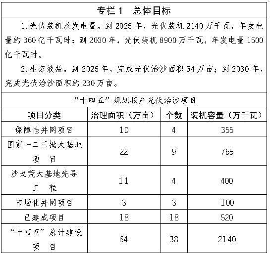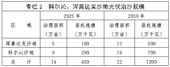 (二)推進(jìn)以林光牧光相結(jié)合的光伏治沙模式,助力打贏黃河“幾字彎”攻堅(jiān)戰(zhàn)。在毛烏素沙地、庫布其沙漠、烏蘭布和沙漠、騰格里東部沙漠及周邊,采用適應(yīng)干旱、半干旱環(huán)境的抗沙塵、高效率光伏技術(shù)路線,統(tǒng)籌光伏開發(fā)、生態(tài)旅游、工業(yè)園區(qū)等分區(qū)域用途管理,對(duì)較集中區(qū)塊進(jìn)行光伏規(guī)?;_發(fā),在沙漠、沙地邊緣居住區(qū)進(jìn)行光伏分布式開發(fā)。到2025年建成光伏裝機(jī)1590萬千瓦,到2030年達(dá)到7200萬千瓦。推進(jìn)種植耐旱、固土的多年生草本植物,在有條件的地區(qū)探索種養(yǎng)結(jié)合模式,實(shí)現(xiàn)林光互補(bǔ)和牧光互補(bǔ)。到2025年完成光伏治沙面積47萬畝,到2030年完成光伏治沙面積約185萬畝。