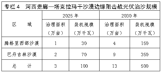 (三)推進(jìn)林光互補(bǔ)的光伏治沙模式,助力打贏河西走廊—塔克拉瑪干沙漠邊緣阻擊戰(zhàn)。在騰格里西部沙漠、巴丹吉林沙漠及周邊,避開高大密集型沙丘和沙丘鏈,采用抗揚(yáng)沙、高效率的光伏技術(shù)集中連片布置光伏項(xiàng)目。到2025年建成光伏裝機(jī)100萬千瓦,到2030年建成500萬千瓦。推廣種植梭梭、駝絨藜等超旱生灌木,蒙古冰草等牧草,形成種植耐旱、固土的多年生草本植物為主的防風(fēng)固沙治理模式。到2025年完成治沙面積3萬畝,到2030年完成治沙面積13萬畝。