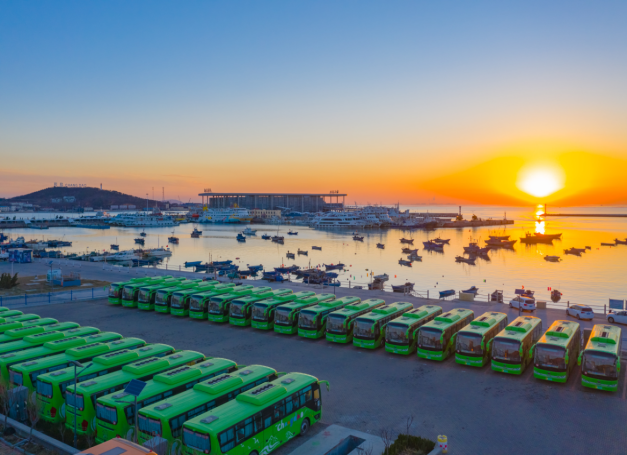 山東煙臺長島漁港碼頭附近,純電動綠色公交車整齊排列。供電公司協(xié)助開展智能充電樁運維工作。