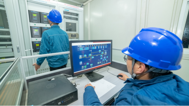 長島智能微電網(wǎng)群示范工程,實現(xiàn)了海島電網(wǎng)安全、綠色、經(jīng)濟、高效穩(wěn)定運行。供電公司工作人員正在砣磯島能量總站巡檢微電網(wǎng)設備。