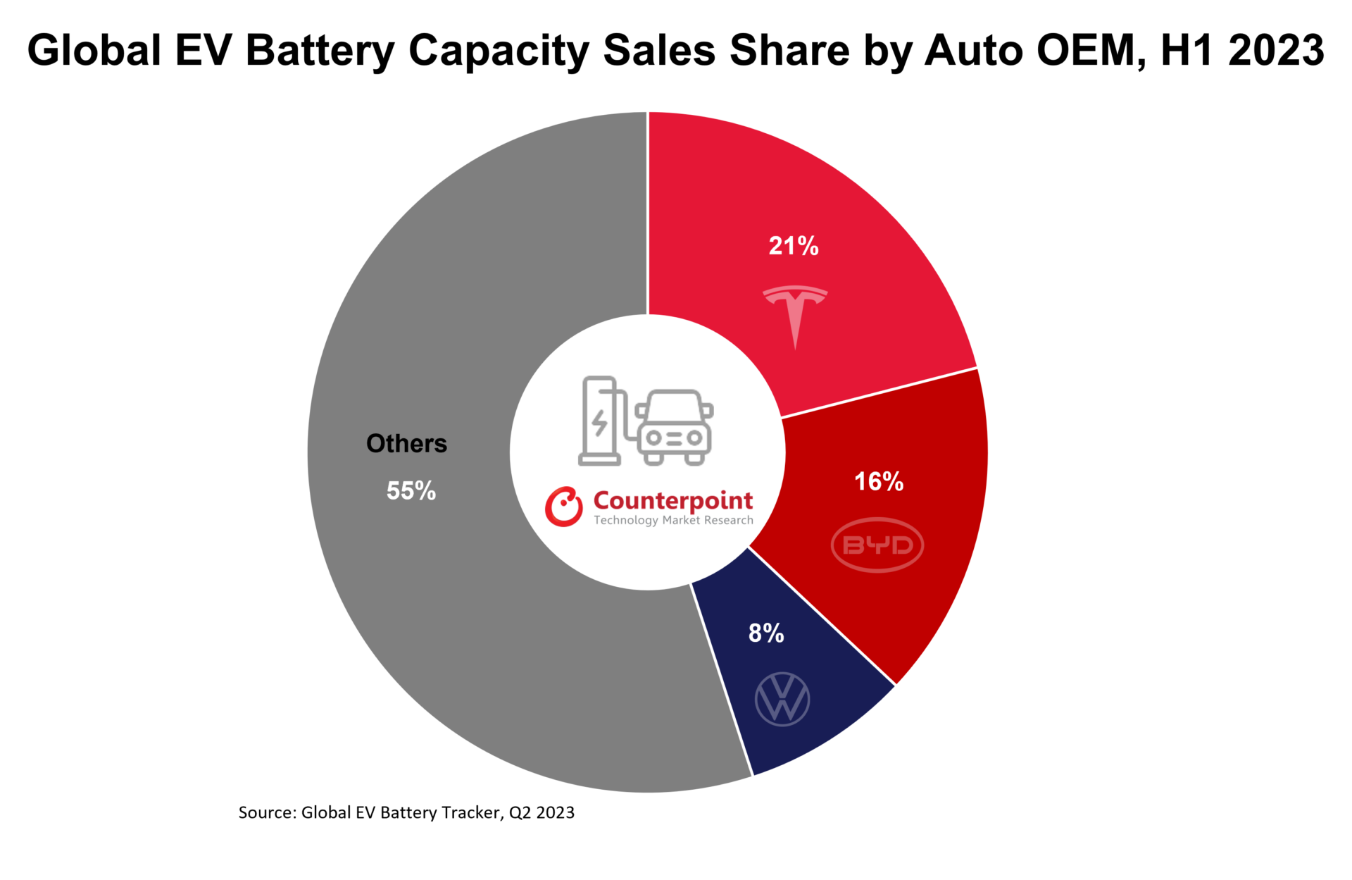 2023年上半年,特斯拉、比亞迪和大眾汽車占電動汽車電池總銷量的近45%。特斯拉Model 3和Model Y的銷量激增,對寧德時代和LG能源解決方案的增長起到了關(guān)鍵作用。特斯拉上海工廠生產(chǎn)的Model 3和Model Y的標(biāo)準(zhǔn)版電池由寧德時代提供,Model 3和Model Y的性能版電池由LG能源解決方案提供?,F(xiàn)代、起亞、福特的電動汽車為SK Innovation的市場占有率起到了積極的作用,而Rivian和寶馬則主要依靠三星SDI作為電池供應(yīng)商。在北美地區(qū),松下作為特斯拉車型的主要電池供應(yīng)商,占據(jù)著關(guān)鍵地位。