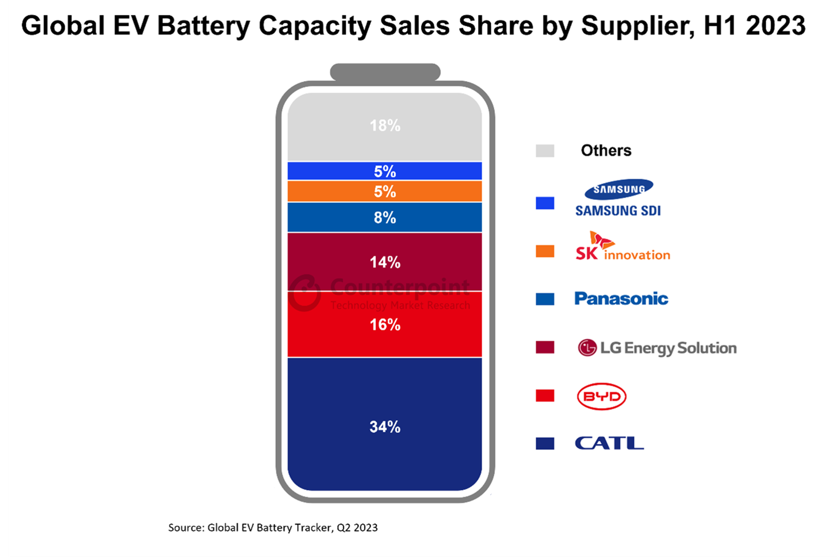 中國儲能網(wǎng)訊:根據(jù)Counterpoint對全球電動汽車電池的最新研究,2023年上半年全球電動汽車電池銷量同比增長54%,達到300GWh以上。在此期間,全球電動汽車銷量也經(jīng)歷了43%的同比增長。寧德時代引領(lǐng)電動汽車電池市場,比亞迪和LG能源解決方案緊隨其后。2023年上半年,這三大公司合計占近2/3的市場份額。在電動汽車電池安裝方面,領(lǐng)先的地區(qū)是中國、美國和歐洲。