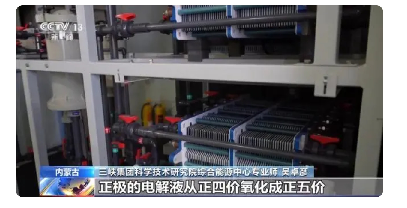 三峽集團(tuán)科學(xué)技術(shù)研究院綜合能源中心專業(yè)師吳卓彥:這套系統(tǒng)就是全釩液流電池儲能系統(tǒng),它的能量主要儲存在電解液中。在工作的時候,電解液通過管路還有泵,來到電堆。充電的時候,正極的電解液從正四價氧化成正五價,把電能儲存起來,在放電的時候,它從正五價再回到正四價,把電能釋放出去。