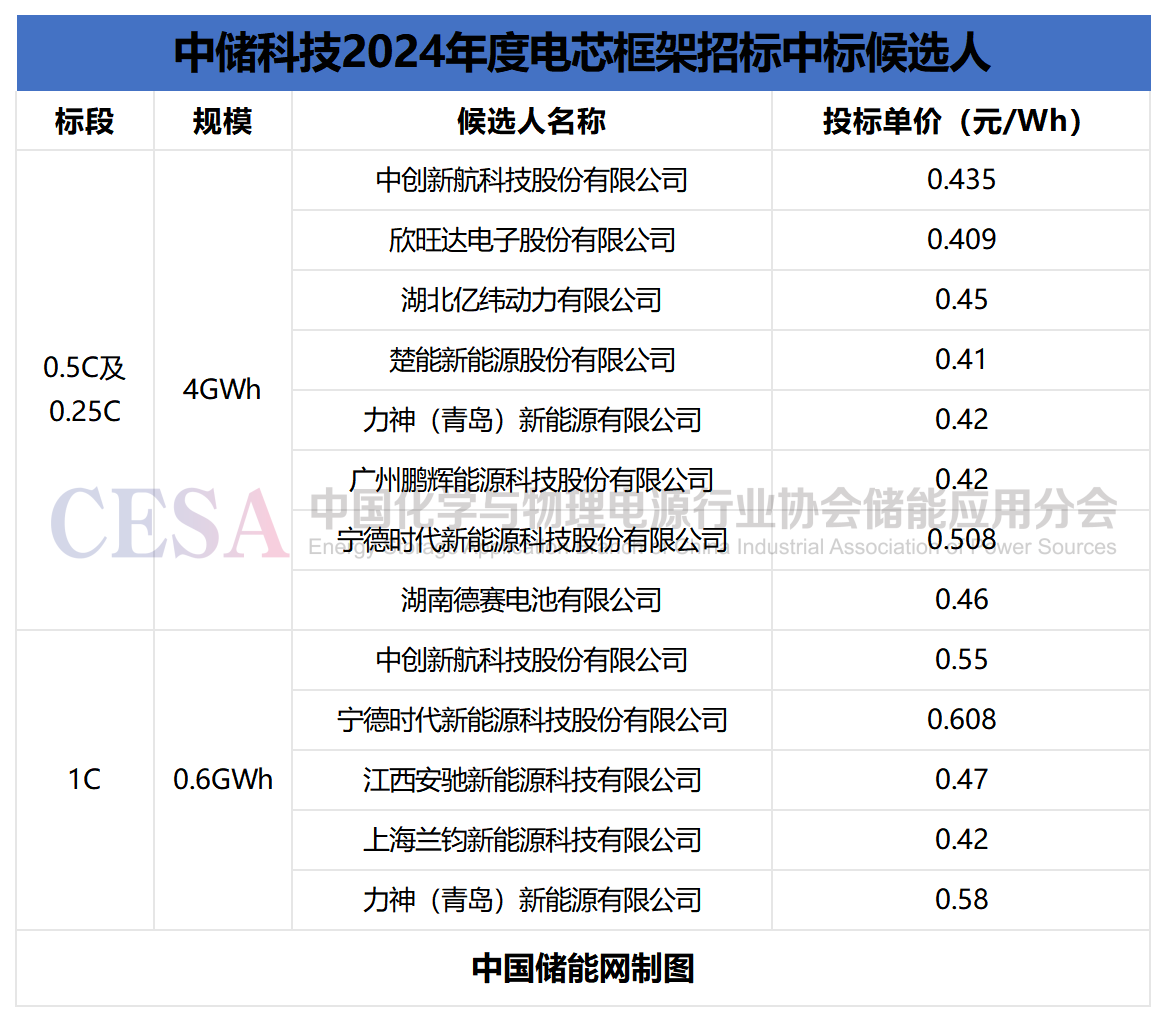 12月24日,中儲科技公示2024年度電芯框架招標(biāo)中標(biāo)候選人,兩個段共有10個候選人入圍。