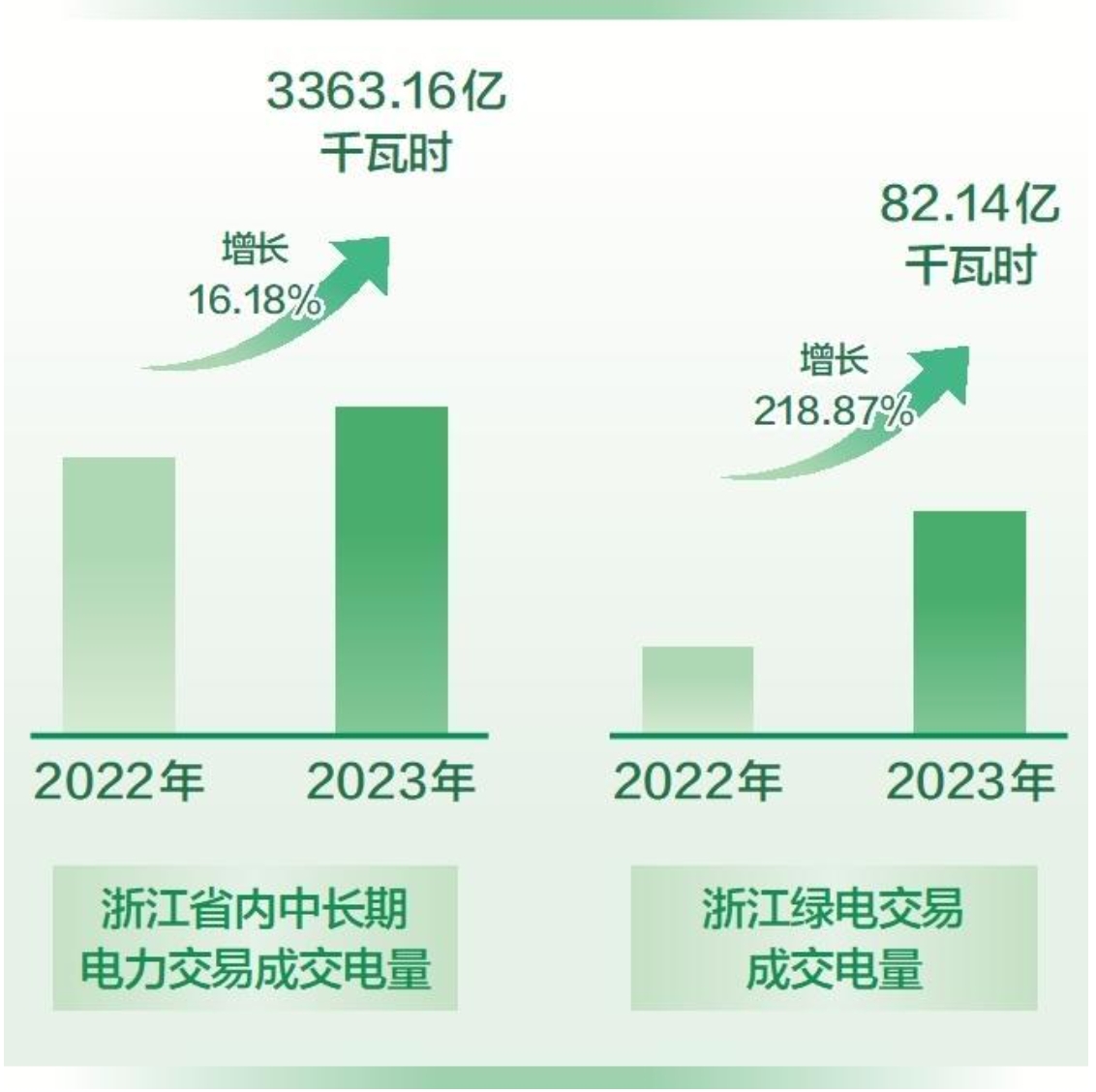 不斷增長(zhǎng)的用電需求是促進(jìn)浙江省內(nèi)中長(zhǎng)期電力交易開展的重要因素之一。國(guó)網(wǎng)浙江省電力有限公司持續(xù)完善中長(zhǎng)期電力交易市場(chǎng)規(guī)則體系,不斷豐富交易品種、提升交易頻次,實(shí)現(xiàn)中長(zhǎng)期電力交易市場(chǎng)按工作整月連續(xù)開市,營(yíng)造良好的交易氛圍。方便的購(gòu)電方式和活躍的綠電交易也進(jìn)一步促進(jìn)了浙江省內(nèi)中長(zhǎng)期電力交易的開展。2023年,國(guó)網(wǎng)浙江電力推廣應(yīng)用電力零售交易平臺(tái)移動(dòng)端——“e-交易”,讓浙江零售客戶實(shí)現(xiàn)“指尖購(gòu)電”,全年累計(jì)服務(wù)客戶約11.76萬(wàn)戶。該公司2023年累計(jì)完成綠色電力交易達(dá)82.14億千瓦時(shí),同比增長(zhǎng)218.87%,實(shí)現(xiàn)亞運(yùn)會(huì)全部場(chǎng)館100%綠色供電,提升浙江全社會(huì)綠色電力消費(fèi)水平。