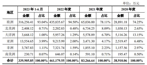 從營(yíng)收區(qū)域構(gòu)成來看,歐洲成為艾羅能源的“盈利場(chǎng)”。近三年來,其70%的營(yíng)收來自歐洲市場(chǎng)。僅2022年,艾羅能源來自歐洲的營(yíng)收就超過40億元人民幣,占比更是達(dá)到了94.50%。