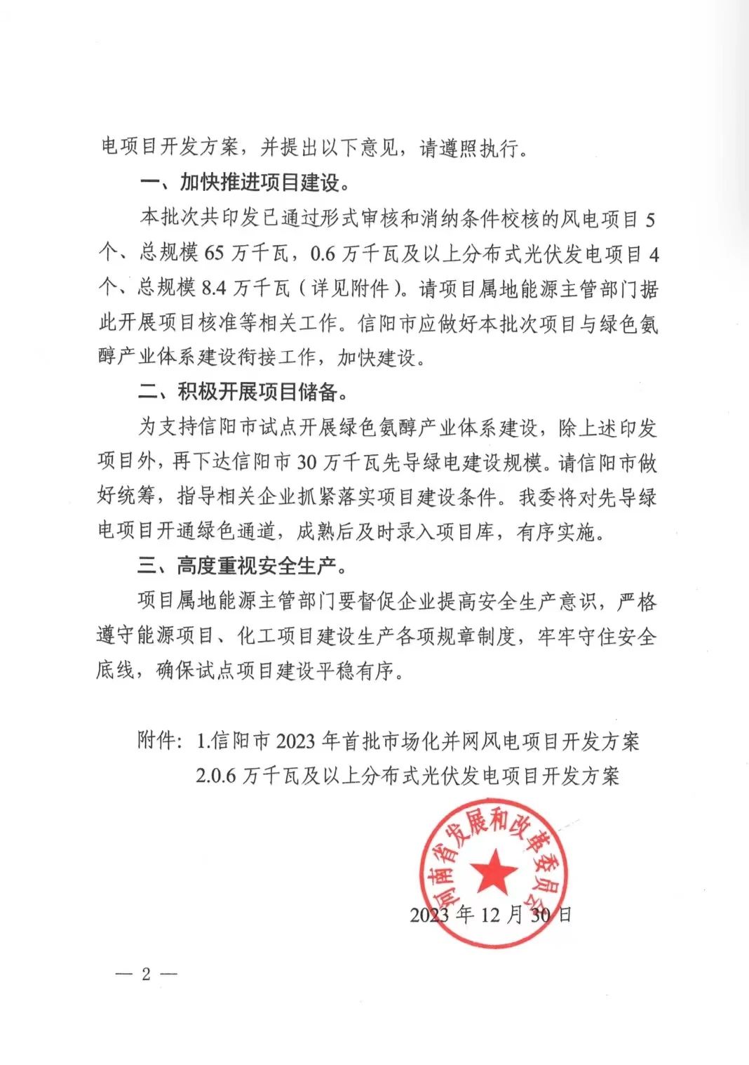 本批次共印發(fā)已通過形式審核和消納條件校核的風(fēng)電項目5個、總規(guī)模65萬千瓦,0.6萬千瓦及以上分布式光伏發(fā)電項目4個、總規(guī)模8.4萬千瓦。同時,為支持信陽市試點開展綠色氨醇產(chǎn)業(yè)體系建設(shè),除上述印發(fā)項目外,再下達(dá)信陽市30萬千瓦先導(dǎo)綠電建設(shè)規(guī)模。