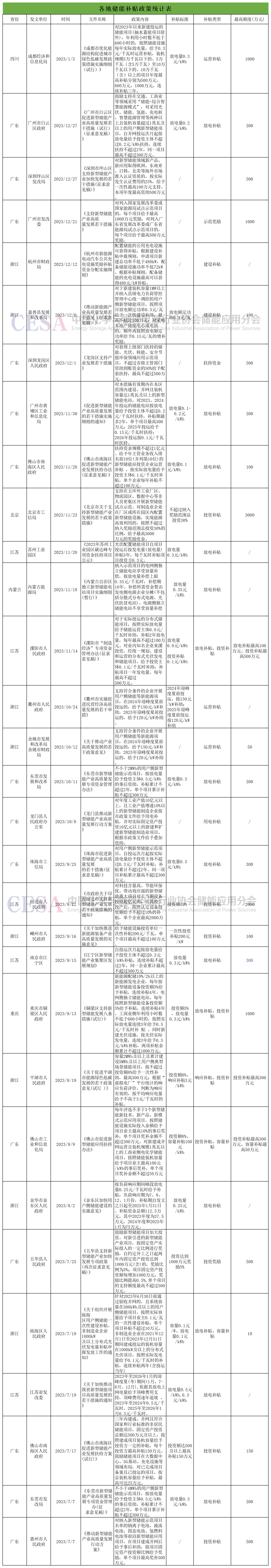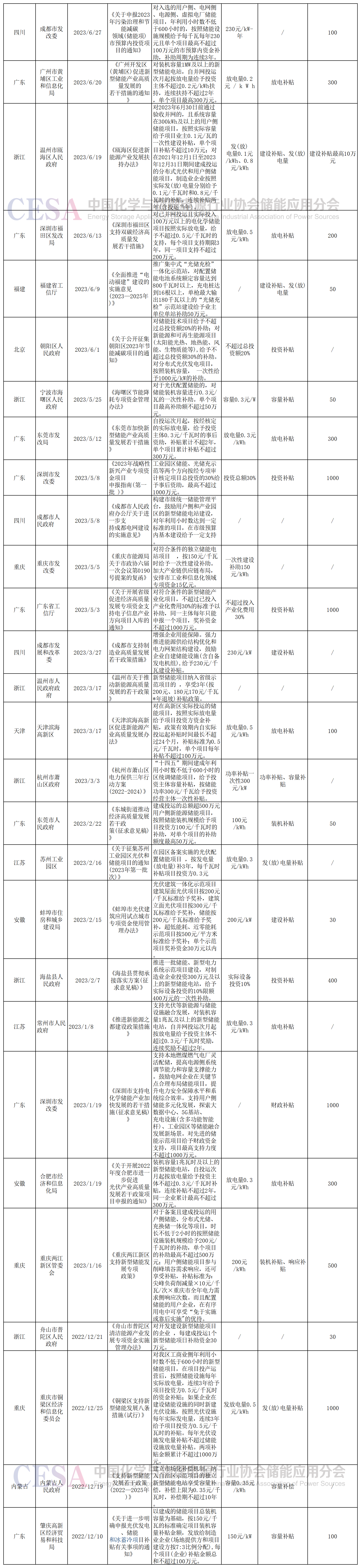 2023年11月,廣州市黃埔區(qū)工業(yè)和信息化局印發(fā)《促進(jìn)新型儲能產(chǎn)業(yè)高質(zhì)量發(fā)展的若干措施實施細(xì)則的通知》明確,對本措施有效期內(nèi)在本區(qū)范圍內(nèi)建設(shè)、并網(wǎng)且裝機容量達(dá)1兆瓦及以上的新型儲能電站,對2023、2024年投運的儲能電站按放電量給予投資主體不超過0.2元/千瓦時扶持,補貼期最多2年,單個項目最高300萬元;2025年投運給予0.15元/千瓦時扶持;2026年投運按0.1元/千瓦時扶持。
