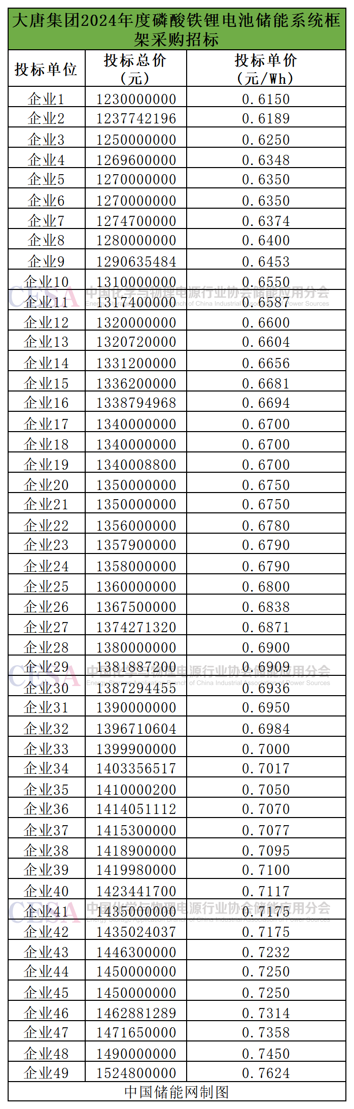 中國儲能網(wǎng)訊:1月16日,大唐集團2024年度磷酸鐵鋰電池儲能系統(tǒng)框架采購項目開標,吸引了49家企業(yè)參與投標,最低報價0.615元/Wh,最高報價0.762元/Wh,平均報價0.683元/Wh。