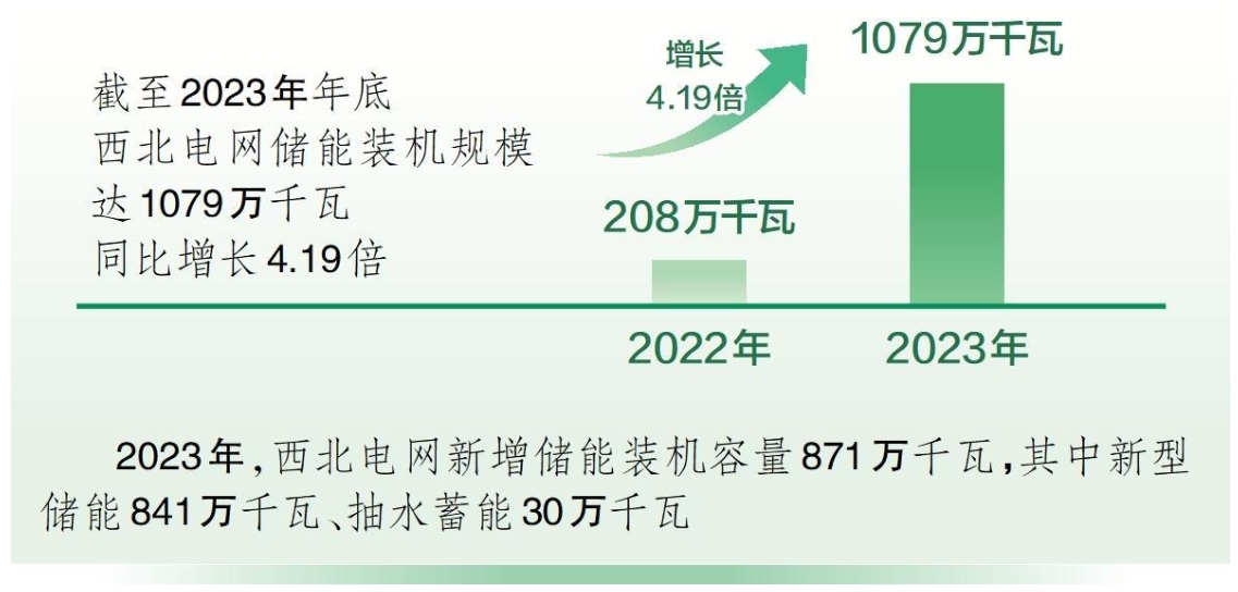 中國(guó)儲(chǔ)能網(wǎng)訊:1月25日從國(guó)家電網(wǎng)有限公司西北分部獲悉,截至2023年年底,西北電網(wǎng)儲(chǔ)能裝機(jī)規(guī)模達(dá)1079萬(wàn)千瓦,較2022年年底增長(zhǎng)了4.19倍。2023年,西北電網(wǎng)新增儲(chǔ)能裝機(jī)容量871萬(wàn)千瓦,其中新型儲(chǔ)能841萬(wàn)千瓦、抽水蓄能30萬(wàn)千瓦。調(diào)節(jié)性電源投產(chǎn)實(shí)現(xiàn)跨越式發(fā)展,為電力保供及新能源電量消納提供了堅(jiān)實(shí)保障。