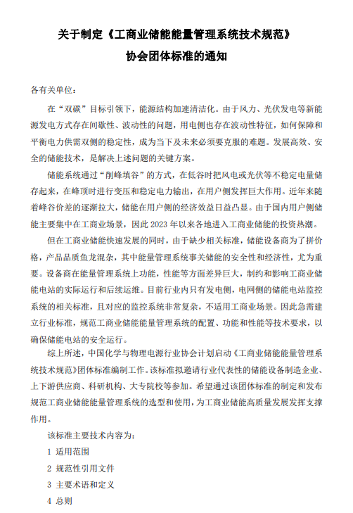 關(guān)于制定《工商業(yè)儲能能量管理系統(tǒng)技術(shù)規(guī)范》協(xié)會團(tuán)體標(biāo)準(zhǔn)的通知