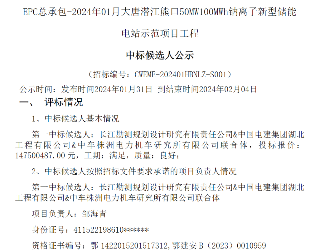中國儲能網(wǎng)訊:1月31日,大唐潛江熊口50MW/100MWh鈉離子新型儲能電站示范項目工程EPC中標候選人公示。