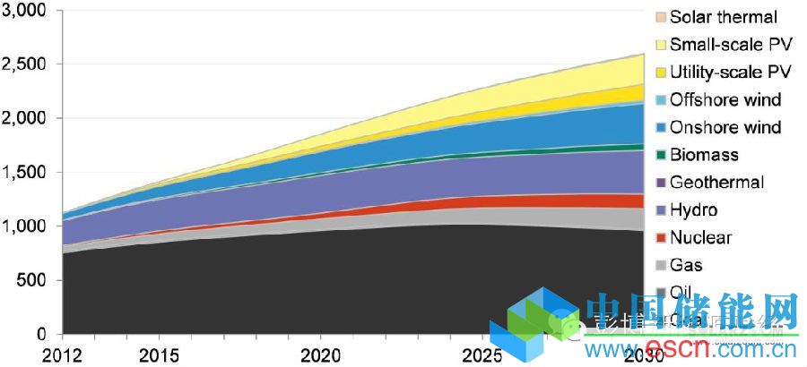 2012-2030年中國各種發(fā)電技術(shù)的累計(jì)裝機(jī)容量預(yù)測(cè)(吉瓦)