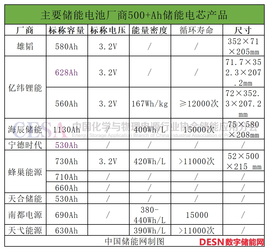 2023年,寧德時代、億緯鋰能、雄韜股份、蜂巢能源、天合儲能和海辰儲能等頭部企業(yè)已經(jīng)相繼推出了500Ah+儲能電芯。
