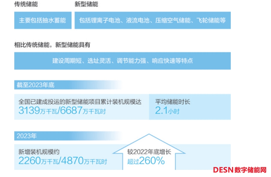 今年的《政府工作報告》提出,發(fā)展新型儲能。新型儲能是實(shí)現(xiàn)碳達(dá)峰碳中和目標(biāo)的重要支撐,包括鋰離子電池、液流電池、壓縮空氣儲能、飛輪儲能等,具有建設(shè)周期短、選址靈活、調(diào)節(jié)能力強(qiáng)、響應(yīng)快速等特點(diǎn)。國家能源局?jǐn)?shù)據(jù)顯示,截至2023年底,全國已經(jīng)建成投運(yùn)新型儲能項(xiàng)目累計裝機(jī)規(guī)模達(dá)3139萬千瓦/6687萬千瓦時,平均儲能時長2.1小時;2023年新增裝機(jī)規(guī)模約2260萬千瓦/4870萬千瓦時,較2022年底增長超過260%。