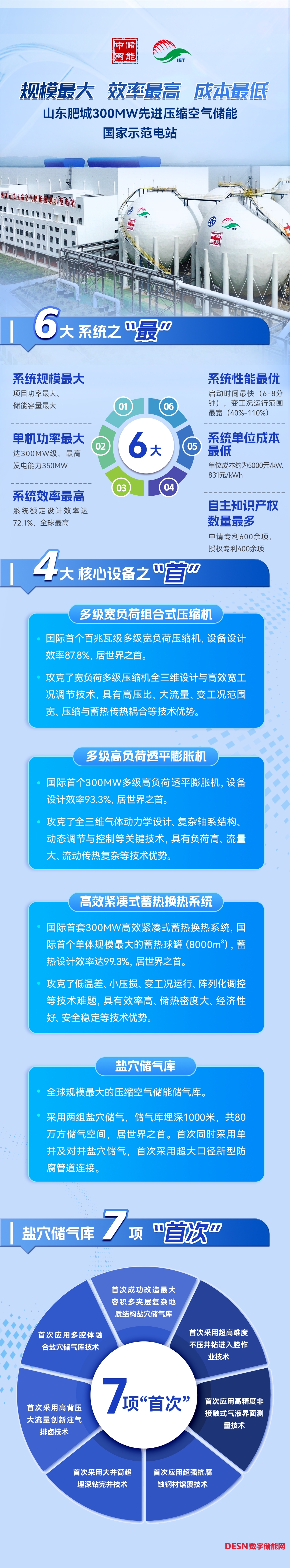 山東肥城300MW/1800MWh先進(jìn)壓縮空氣儲能國家示范項目在系統(tǒng)設(shè)計、裝備研制、工程實施等諸多領(lǐng)域,實現(xiàn)了十余項關(guān)鍵技術(shù)突破,創(chuàng)造了六項國際之最,進(jìn)一步推動了國際壓縮空氣儲能技術(shù)與產(chǎn)業(yè)發(fā)展。