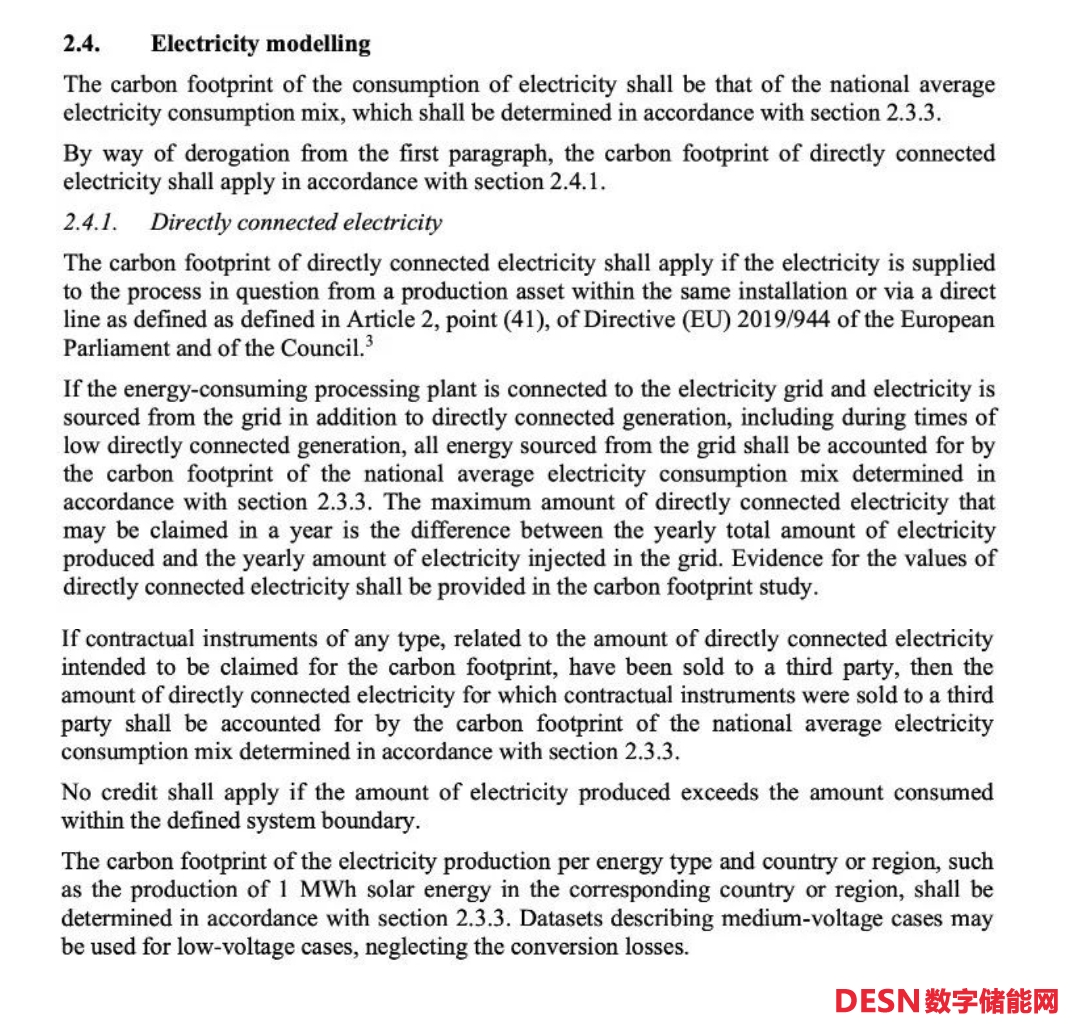 多位業(yè)內人士告訴《南方能源觀察》(以下簡稱“eo”),規(guī)則草案附件中的“2.4.電力建?!保‥lectricity modelling)章節(jié)明確,計算電動車電池電力消費碳足跡時默認基于“國家平均電力消費組合”(national average electricity consumption mix),電力直連的情況例外。原文表述見下圖: