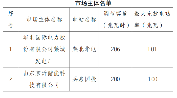 中國儲能網訊:近日,山東電力交易中心公示第七批獨立儲能設施主體信息,新增萊北華電儲能電站、兵房國投儲能電站2個獨立儲能電站進入電力現貨市場。涉及華電國際電力股份有限公司萊城發(fā)電廠、山東京沂儲能科技有限公司兩家市場主體,容量共計201MW/406MWh。