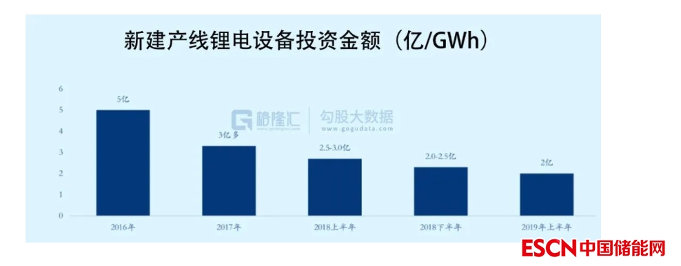 其次,近幾年鋰電池產(chǎn)線設(shè)備價格的下降,也令到整個行業(yè)準入門檻有了一些降低,規(guī)模效應(yīng)疊加設(shè)備零部件國產(chǎn)化導(dǎo)致鋰電設(shè)備成本大幅下降,目前國內(nèi)鋰電池產(chǎn)線單GWh產(chǎn)能投資價格已從原來的10億元左右降至2.4億元以下,降幅非常明顯。