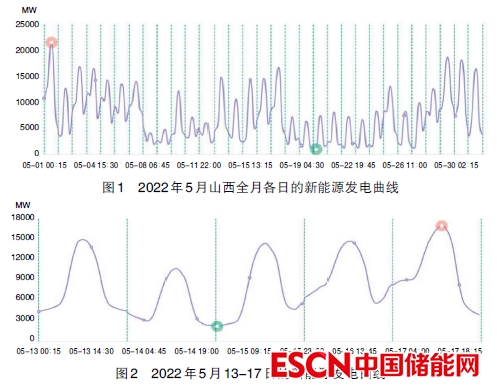 受光照與風(fēng)力變化影響,日內(nèi)不同時(shí)刻的新能源發(fā)電波動(dòng)更為明顯,這也是經(jīng)常為大家所注意到的重點(diǎn)。圖2展示了山西新能源在2022年5月13~17日的發(fā)電曲線,可以看出,一天的24小時(shí)之內(nèi),出力多的與出力低的時(shí)刻相比,在5月15日,差額值達(dá)5倍之多。因此在很多的日子里,新能源發(fā)電高峰的幾個(gè)小時(shí),可能會(huì)導(dǎo)致電力系統(tǒng)出現(xiàn)消納困難;而新能源發(fā)電不足的晚高峰或者晚間時(shí)段,則存在如何通過多種手段保障供電可靠性的問題。