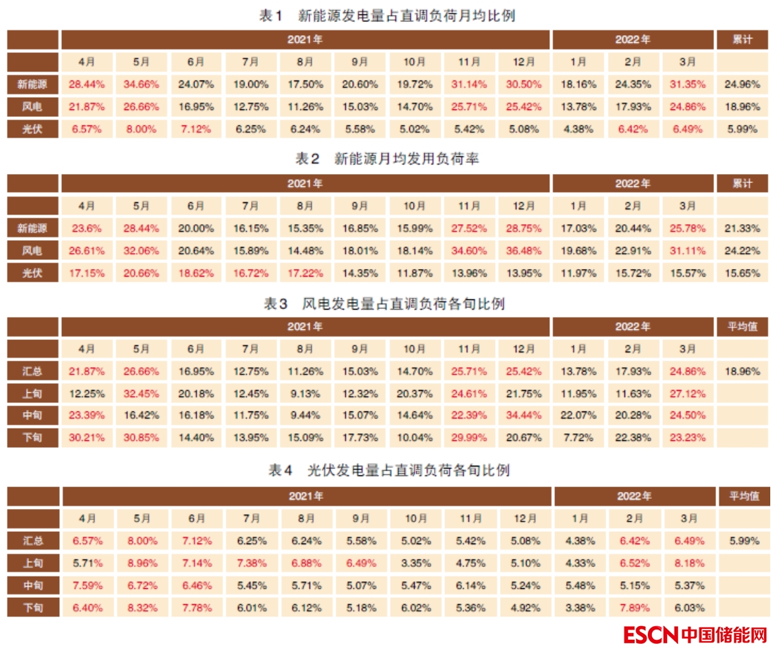 下面的表1展示的是新能源發(fā)電量占直調(diào)負(fù)荷用電量的比例,表2展示的是新能源自身的月均負(fù)荷率??梢钥吹剑履茉窗l(fā)電存在明顯的月度不均衡,從負(fù)荷率來說,風(fēng)電在2021年4、5、11、12月以及2022年3月發(fā)電較多,遠(yuǎn)超其他月份;光伏發(fā)電在2021年4、5、6、7、8月比較多,不同月份的相對(duì)量變化也非常大。