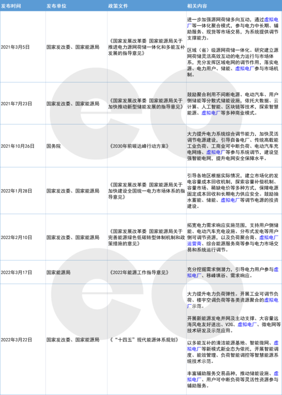 2022年3月國家發(fā)改委、國家能源局發(fā)布的《“十四五”現(xiàn)代能源體系規(guī)劃》四次提及“虛擬電廠”。2022年2月發(fā)布的《國家發(fā)展改革委 國家能源局關(guān)于完善能源綠色低碳轉(zhuǎn)型體制機(jī)制和政策措施的意見》提出,拓寬電力需求響應(yīng)實施范圍,支持虛擬電廠運營商等參與電力市場交易和系統(tǒng)運行調(diào)節(jié)。此前,2021年10月,國務(wù)院發(fā)布的《2030年前碳達(dá)峰行動方案》,提出加快靈活調(diào)節(jié)電源建設(shè),引導(dǎo)虛擬電廠等多種資源參與系統(tǒng)調(diào)節(jié)。