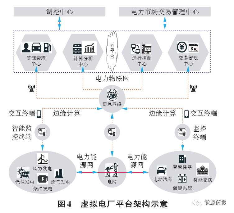 虛擬電廠總體技術(shù)路線包括1個(gè)平臺(tái)、2張網(wǎng)絡(luò)、4大中心和多方應(yīng)用。1個(gè)平臺(tái)即虛擬電廠智慧管控平臺(tái),基于云平臺(tái)部署。4大中心包括資源管理中心、計(jì)算分析中心、運(yùn)行控制中心和交易管理中心,根據(jù)業(yè)務(wù)分類,基于“微應(yīng)用”服務(wù)架構(gòu)的多方應(yīng)用分別部署于各中心,支持應(yīng)用彈性伸縮即快速部署和快速下線。平臺(tái)基于電力物聯(lián)網(wǎng)可接入風(fēng)力發(fā)電、光伏發(fā)電、柴油發(fā)電、燃?xì)獍l(fā)電,儲(chǔ)能燈分布式電源和電動(dòng)汽車等負(fù)荷,同時(shí)基于平臺(tái)的運(yùn)行控制中心,可控制電力能量的合理流動(dòng)。同時(shí),平臺(tái)支持和調(diào)度中心、電力市場(chǎng)交易管理中心進(jìn)行信息交互。