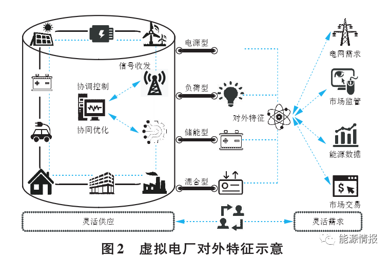 (1)虛擬電廠概念是電廠概念的衍生,運(yùn)用了信息技術(shù)和軟件技術(shù),綜合了需求響應(yīng)、電力市場(chǎng)、能源調(diào)度等機(jī)制,能源高度聚合且具有多場(chǎng)景、多樣化服務(wù)能力新型能源生態(tài)系統(tǒng)。