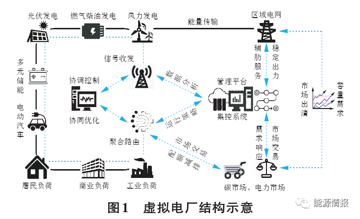 虛擬電廠顧名思義就是虛擬化的電廠,其結(jié)構(gòu)示意如圖1所示。它不是一個(gè)真實(shí)的物理電廠,但起到了電廠的作用:發(fā)出電能,參與能量市場(chǎng);通過調(diào)節(jié)功率來參與輔助服務(wù)市場(chǎng)調(diào)峰、調(diào)頻等。