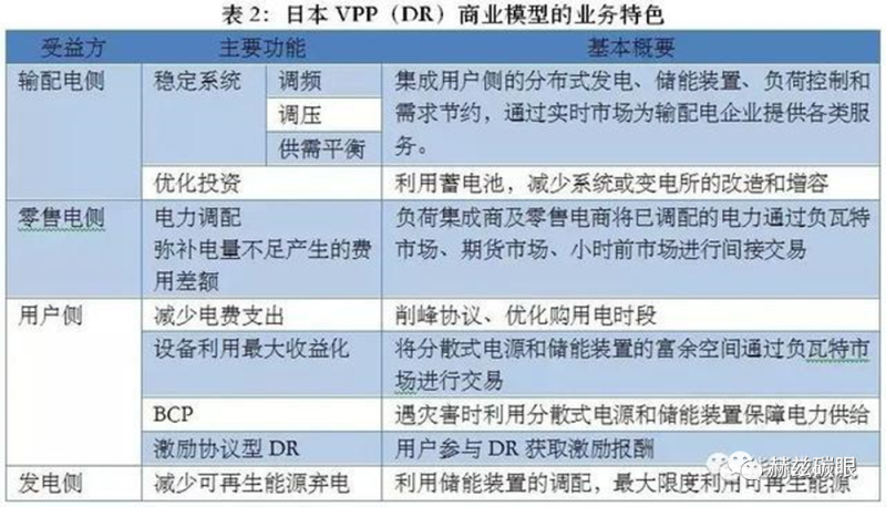 日本推廣VPP(DR)的重點(diǎn)集中在住宅、辦公大樓、工廠、商業(yè)設(shè)施、公共事業(yè)和電動(dòng)汽車等六大領(lǐng)域,以“光伏+儲(chǔ)能”為主要形式,如下圖:列舉了日本VPP(DR)商業(yè)模式的主要業(yè)務(wù)特色。