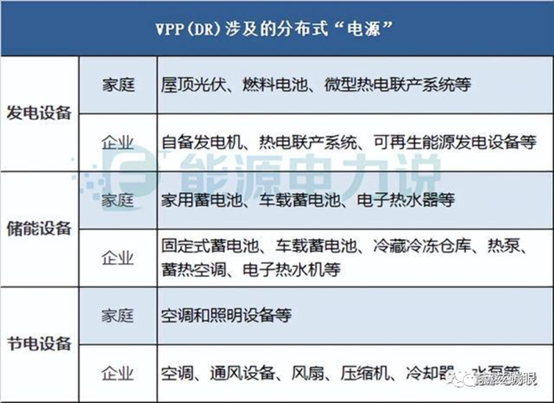 日本:將狹義上的VPP定義為直接并網(wǎng)的可再生能源發(fā)電設(shè)備和儲(chǔ)能裝置,而廣義上的VPP還包括用戶側(cè)的新型DR,但傳統(tǒng)DR則不包含在其中。VPP(DR)涉及的分布式“電源”主要包括如下三類。