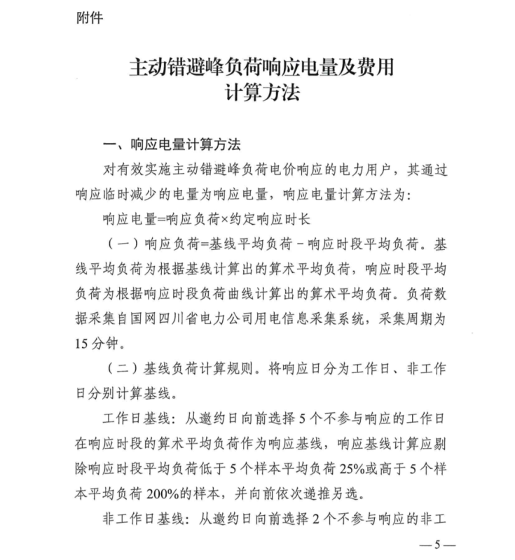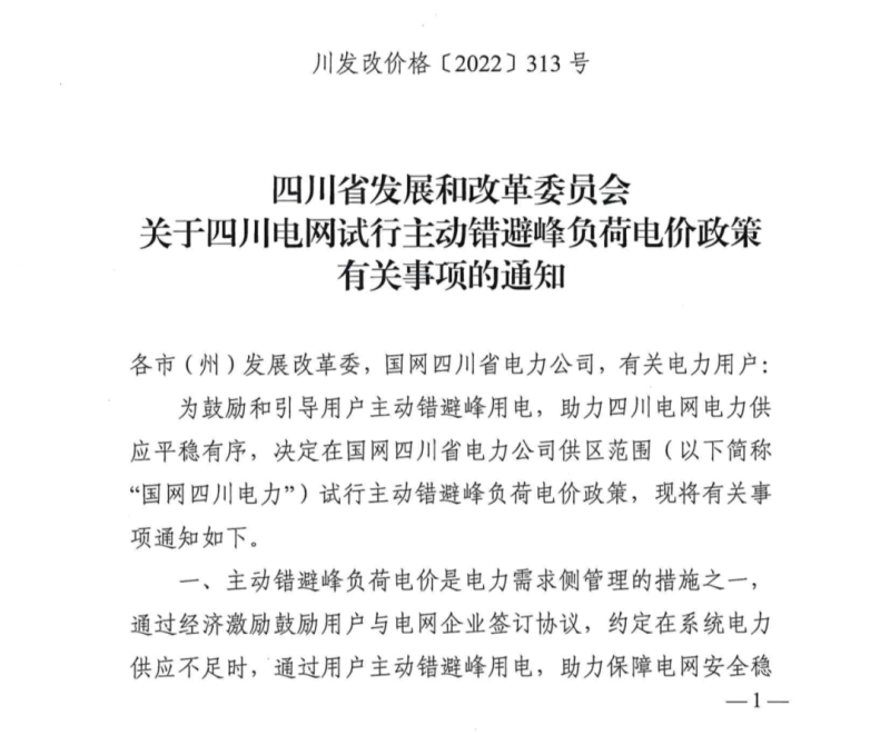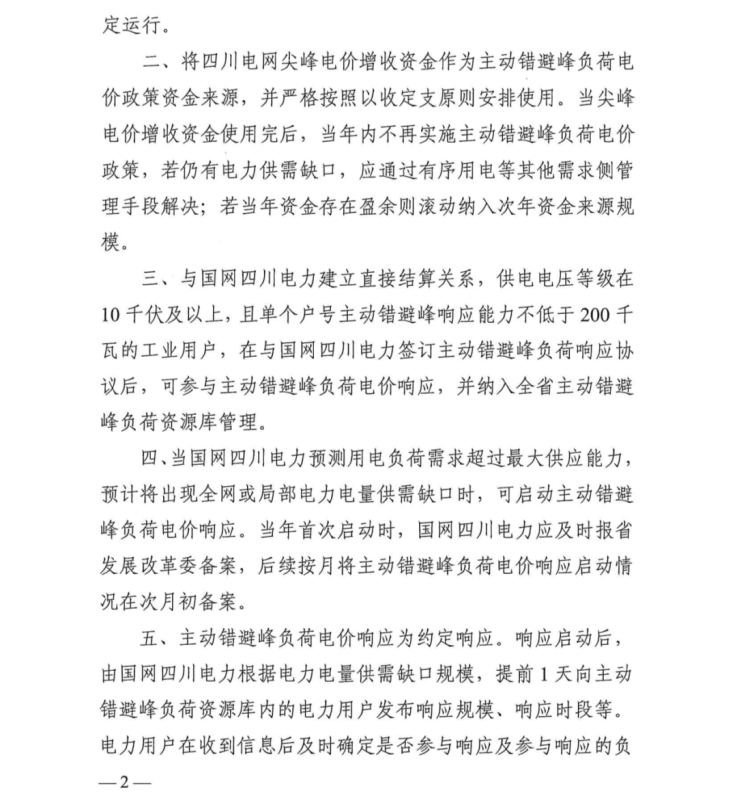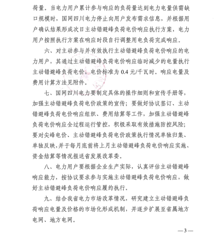 中國儲(chǔ)能網(wǎng)訊:近日,四川省發(fā)改委發(fā)布《關(guān)于四川電網(wǎng)試行主動(dòng)錯(cuò)避峰負(fù)荷電價(jià)政策有關(guān)事項(xiàng)的通知》。通知指出,在國網(wǎng)四川電力供區(qū)范圍試行主動(dòng)錯(cuò)避峰負(fù)荷電價(jià)政策,對(duì)主動(dòng)參與并有效執(zhí)行主動(dòng)錯(cuò)避峰負(fù)荷電價(jià)響應(yīng)的電力用戶,其通過主動(dòng)錯(cuò)避峰負(fù)荷電價(jià)響應(yīng)臨時(shí)減少的電量執(zhí)行主動(dòng)錯(cuò)避峰負(fù)荷電價(jià),電價(jià)標(biāo)準(zhǔn)為0.4元/千瓦時(shí)。